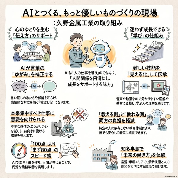 常滑市に工場を構え、半田市からも通いやすい立地に根ざす久野金属工業が、こうした先進的な取り組みを進めていることは大きな強みです。製造業の現場では、技術力や設備だけでなく、気持ちよく働ける環境づくりがますます重要になっています。AIを活用して人間関係のストレスや伝達ロスを減らし、教育の質を高め、誰もが力を発揮しやすい職場をつくる。その挑戦は、知多半島、半田市・常滑市エリアで求人をお探しの方にとっても、安心して成長できる職場を選ぶ際の大きな判断材料となるでしょう。